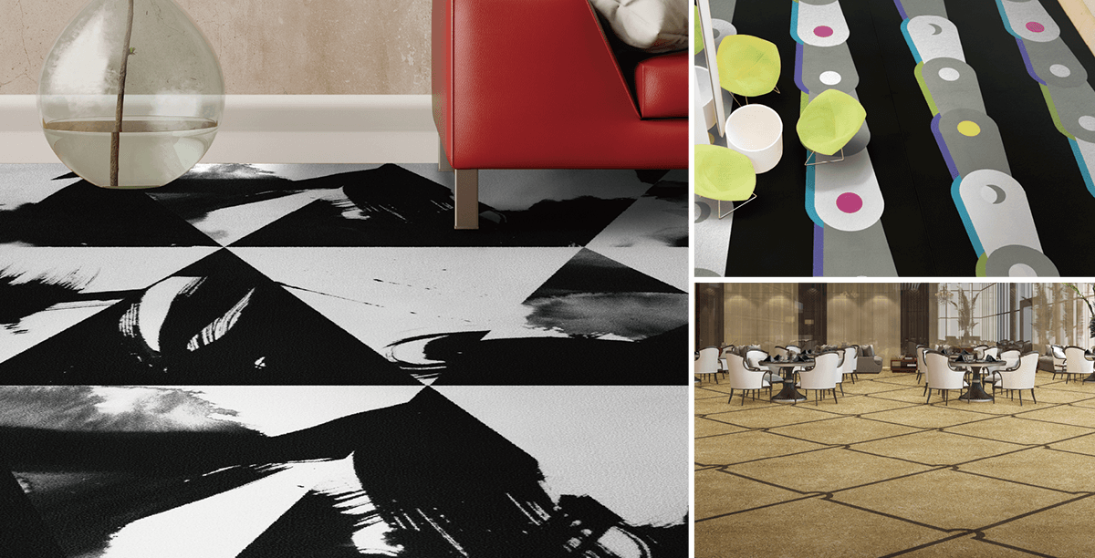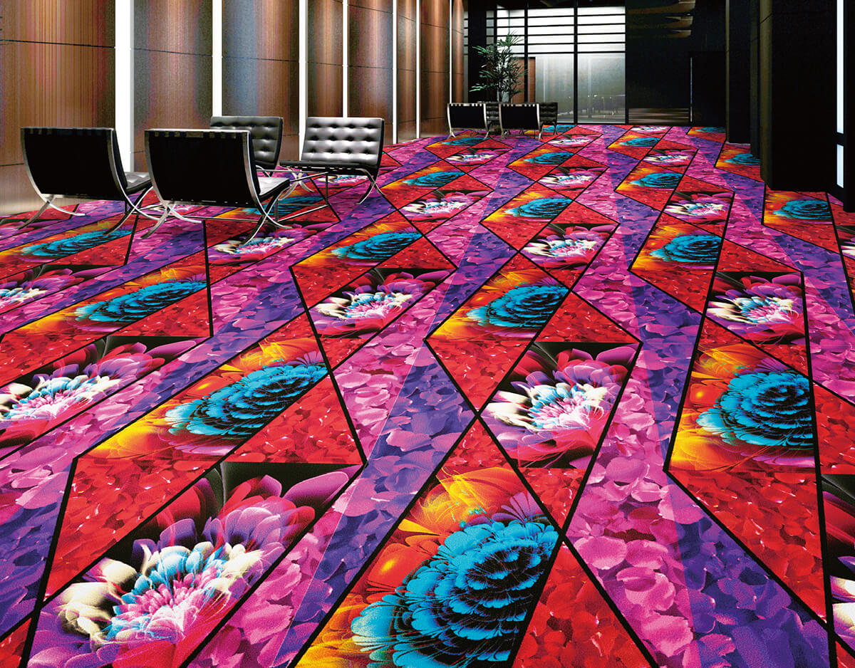 The graphic carpet comprising design themes invigorates the floor with its sense of design/scale full of originality customized with a variety of styles such as stores, office, commercial facility, cultural facility, amusement facility, hotel, etc.