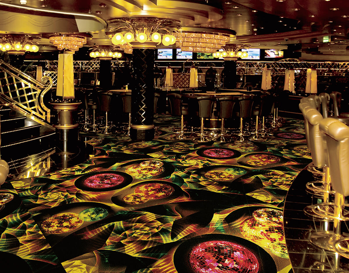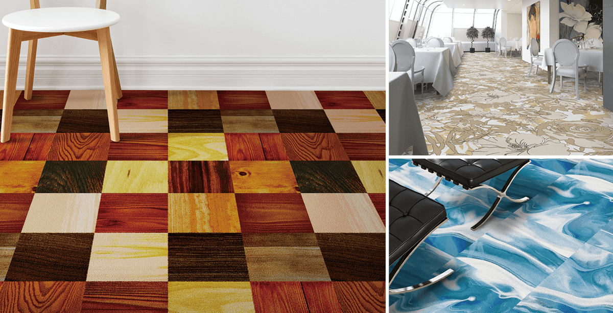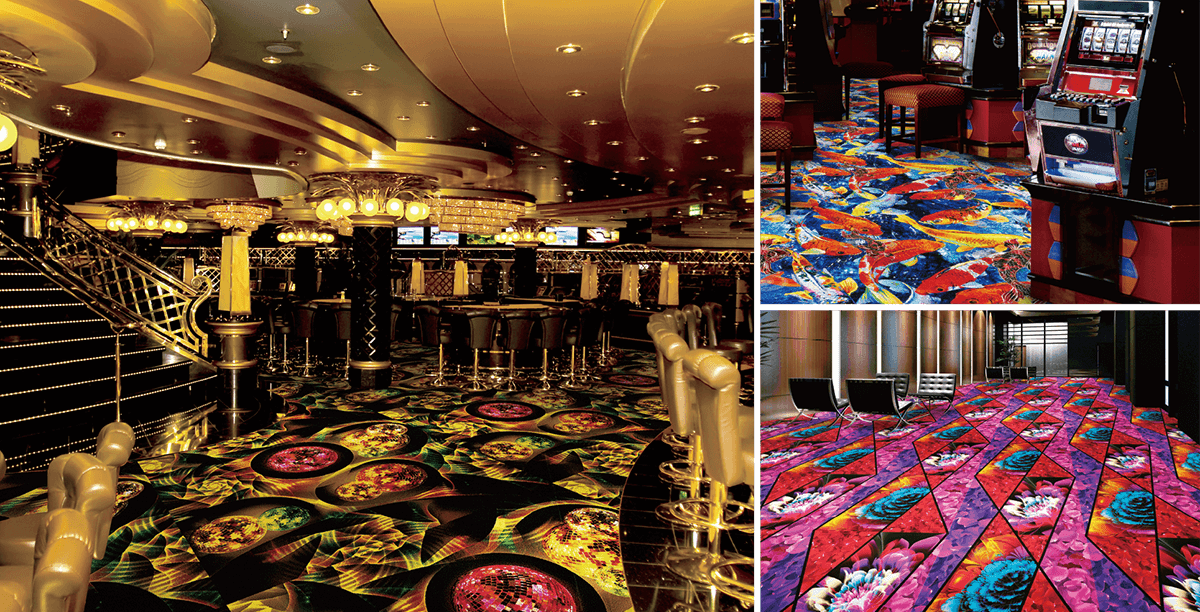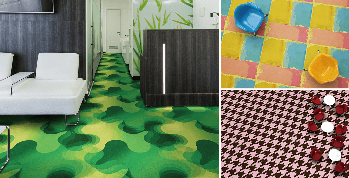 The graphic carpet comprising design themes invigorates the floor with its sense of design/scale full of originality customized with a variety of styles such as stores, office, commercial facility, cultural facility, amusement facility, hotel, etc.