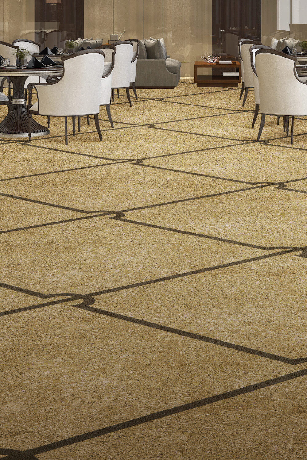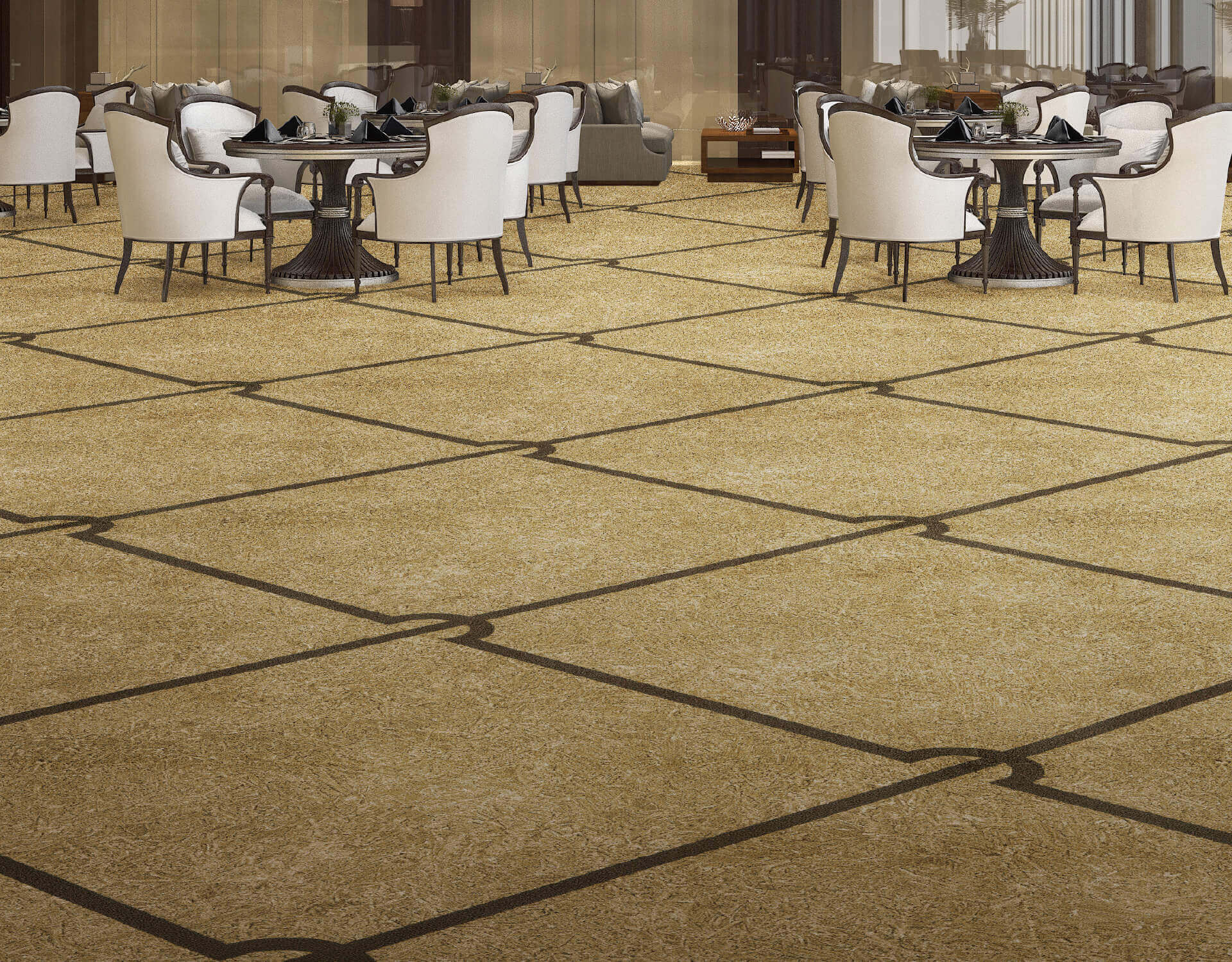 Incorporate natural materials such as flower, wood, stone, etc. into your carpet. Although large and impressive, the flower/ivy pattern can express the natural beauty. The concept for wood/stone pattern is "floor" where you can play and lie down. The natural materials and the carpet texture creates the warmth in the space and directs the comfortableness at office, hotel, commercial facility, restaurants and so on.